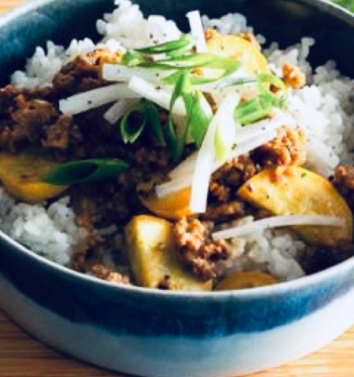 Transfer the rice to individual bowls and top with the pork and squash. Garnish with the pickled turnips, scallions and serve.